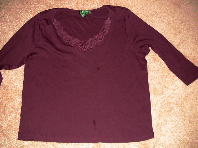 This top is a Ralph Lauren shirt I bought from Macy’s. It probably cost over $40 or so. I can only wear it around the house now.