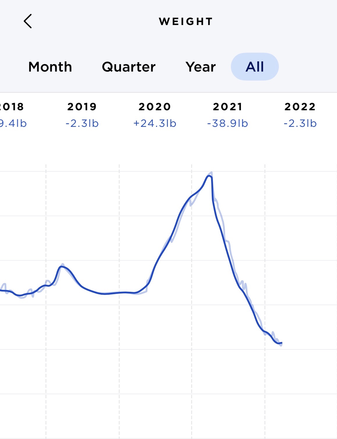 On the weight loss itself, I’m disappointed. Over the course of 52 weeks, I’ve only lost a total of 47.3 lbs. That averages out to about .9 (nearly a pound) a week. You can see from the chart, starting at the end of the hockey stick slope upward in the beginning of 2021, I consistently kept losing throughout 2021 and now into 2022. I have not faltered or regained any weight. It’s been a steep slope downwards.